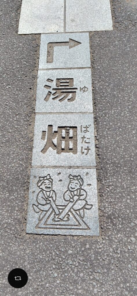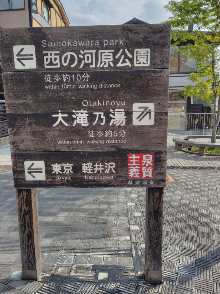 「明らかに違う道だ!」と気づいていたのだが、なんとなくぶらぶら。気がつけば、歩き始めてなんと1時間半、午後1時を過ぎた頃でした。疲労困憊の父ちゃん、母ちゃん、そしてゆず子(ワンコ)🐶。​なんとか湯畑にたどり着いたその時、目に入ってきた看板が…​