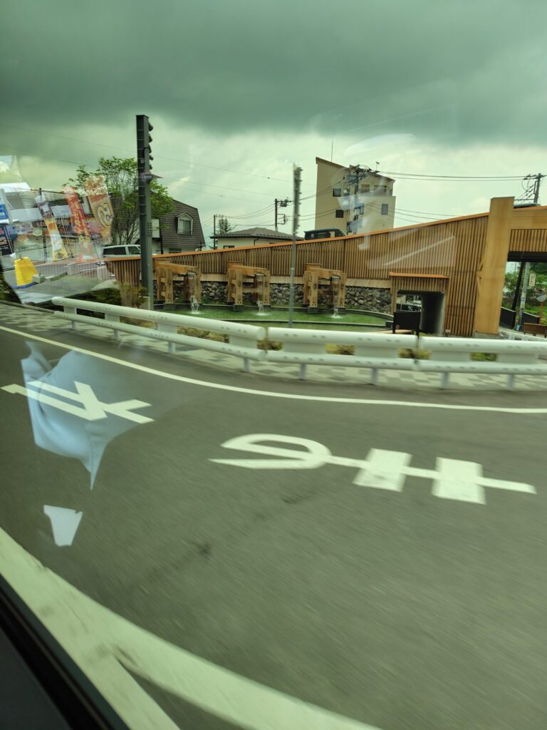 旅行に出て、部屋を出る時にいつも感じるのが、過ごした空間から離れる時の哀愁です。​「2日間ありがとう、楽しかったです」​言葉にはしませんが、胸の中で想いを伝えて部屋をあとにしました。​宿の外には、駐車場まで送ってくれるバスが待機しています。荷物を積み込み、バスの窓から草津温泉街を眺めます。​実は、父ちゃんには一つだけ心残りがありました。それは、草津温泉の新しいシンボルである温泉門に行けなかったことです。​「次来た時は絶対行こう!」そう思いながら、せめて思い出に、と車窓から温泉門を写真におさめました。